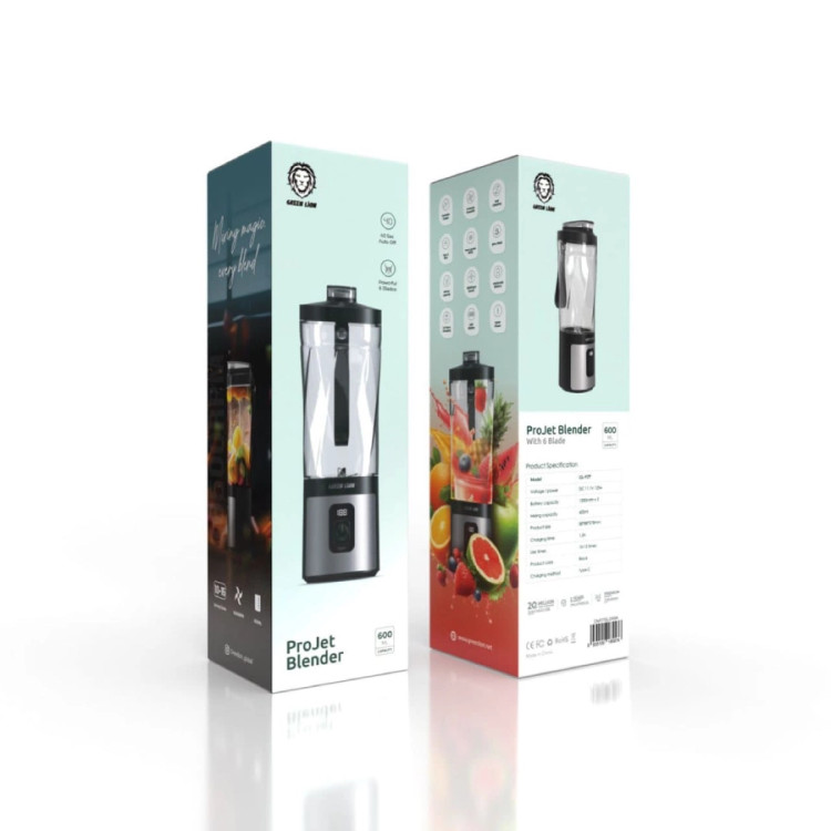 در بلندر قابل حمل گرین لاین Projet Blender از 6 تیغه فلزی به کار رفته است. این 6 تیغه در کنار قدرت 120 واتی و 16500 دور بر دقیقه چرخش باعث میشود شما بتوانید میوههای زیادی را با قدرت و سرعت بالا خرد کنید و یک اسموتی جذاب و خوشمزه داشته باشید. طریقه کار این بلندر بدین صورت است که دکمه آن را فشار داده و ظرف 40 ثانیه میوههای شما را خرد و مخلوط میکند. سپس دستگاه به طور خودکار خاموش میشود. طرز کارکرد این دستگاه بدین صورت است که اگر داخل آن ریخته و روشن کنید، به طور خودکار بدنه داخلی دستگاه تمیزمیشود. برای این کار از آب خنک استفاده کنید.