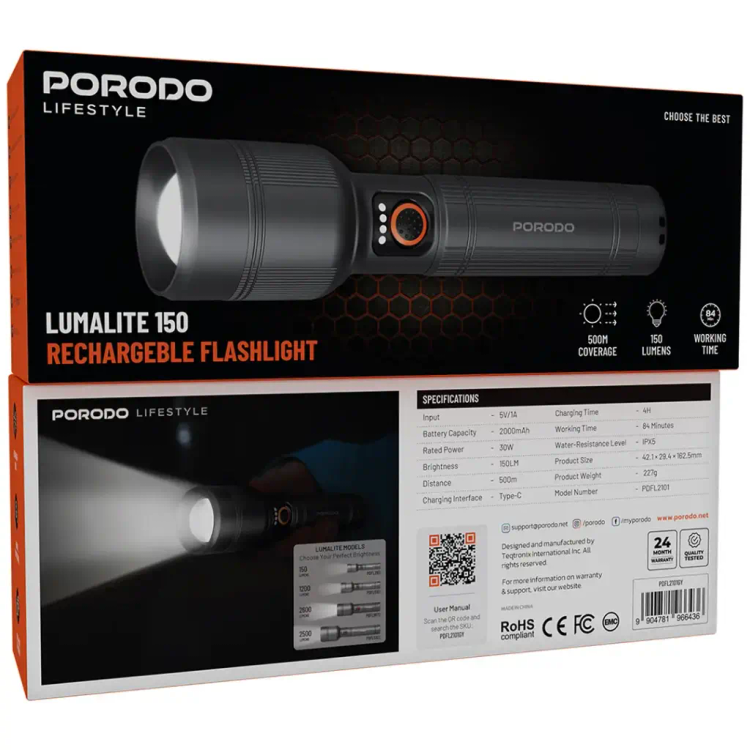 نام محصول: چراغ قوه شارژی Porodo Lumalite 150 – خاکستری