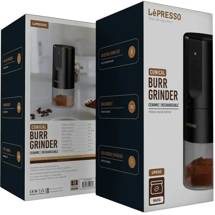 آسیاب قهوه لِپرسو مدل LPCFFM0032 یک دستگاه برقی و قابل حمل است که برای دوستداران قهوه طراحی شده تا بتوانند در خانه، محل کار یا سفر طعم دانههای تازه را با آسیاب دقیق تجربه کنند. این آسیاب مجهز به تیغههای سرامیکی با طراحی مخروطی است که دانههای قهوه را یکنواخت و بدون افزایش دما آسیاب میکند — نتیجهاش پودر قهوهای با عطر و طعم بهتر و طبیعیتر برای تهیه اسپرسو، فرنچپرس یا قهوه صافی است.
