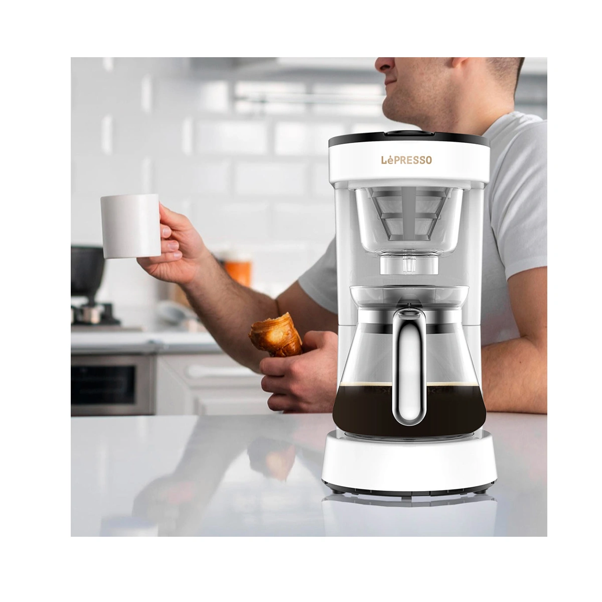 بدنه سفید با بخشهای شفاف و قوری شیشهای، ظاهر مدرن و مینیمالی به این دستگاه میدهد که بهخوبی با آشپزخانههای روشن و فضاهای مینیمال هماهنگ میشود. طراحی شفاف باعث میشود دستگاه در ویترین یا روی کانتر فروشگاه MTM نیز جلوه خوبی داشته باشد و مشتری بهخوبی حجم و فرآیند دمآوری را درک کند.